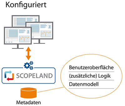 Alles basiert durchgängig auf einfachen, interaktiv erfassten Beschreibungen, Business Rules und UML- bzw. Workflowaktionen und -zuständen. Aus all dem generiert SCOPELAND sinnvolle, im Prinzip schon benutzbare Benutzeroberflächen, die dann mit einem sehr intelligenten Form Designer und Drag & Drop- bzw. Mash Up-Mechanismen interaktiv weiter ausgestaltet und optimiert und wiederum als Metadaten abgelegt werden. So sind alle Einstellungen zu jedem Datenobjekt, von den 'physischen' Datenbankeigenschaften, oder die Verarbeitungslogik bis hin zur Art und Weise der Darstellung an nur einer Stelle zentral gespeichert – in der Metadatenbank. Das ist der Schlüssel zur einzigartigen Flexibilität von SCOPELAND-basierten Lösungen: alles kann jederzeit verändert werden, auf allen Ebenen und ohne andere Programmteile zu beeinflussen.