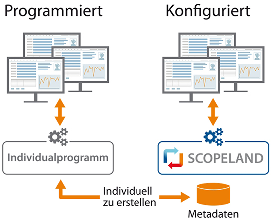 Der Begriff „SCOPELAND-Methode“ steht für eine moderne Low-Code-Herangehensweise zur Entwicklung anspruchsvoller Datenbankanwendungen – weitestgehend oder vollständig ohne manuelle Programmierung. Auf diese Weise erreicht man erhebliche Kostenvorteile, kürzere Projektlaufzeiten, und vor allem: eine bislang nicht gekannte Flexibilität der so entstehenden Software hinsichtlich Änderungen aller Art und auf allen Ebenen. Dies wiederum ermöglicht nicht nur eine drastische Reduzierung der Softwarepflegekosten, es erlaubt auch in besonderem Maße iteratives Prototyping und agile Softwareentwicklung – um sich so optimal an die tatsächlichen Anforderungen der jeweiligen Endanwender anzupassen und letztlich jedes Projekt erfolgreich und im Zeitplan abzuschließen.