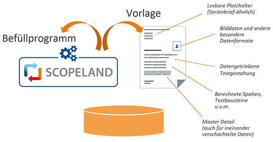 Die Entwicklung erfolgt zunächst analog zu der interaktiver Bildschirmmasken: indem sich der Benutzer hierarchisch angeordnete Datensichten interaktiv zusammenstellt, vielleicht ergänzt um berechnete Spalten, Gruppensummen oder ähnliche Extras. Die druckbare Formatierung und Textgestaltung aber überlässt SCOPELAND den dafür besser geeigneten Office-Programmen.