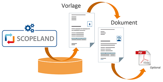 Mit einem besonders eleganten patentierten Verfahren vorlagenbasierter Dokumentengenerierung können selbst anspruchsvollste und umfangreiche Druckausgaben ohne Scripting und ohne besondere IT-Kenntnisse erstellt werden, und dies in einem ansprechenden Layout, wie es für amtliche Dokumente (z.B. Bescheide) oder geschäftliche Unterlagen (z.B. Angebote) erwartet wird.